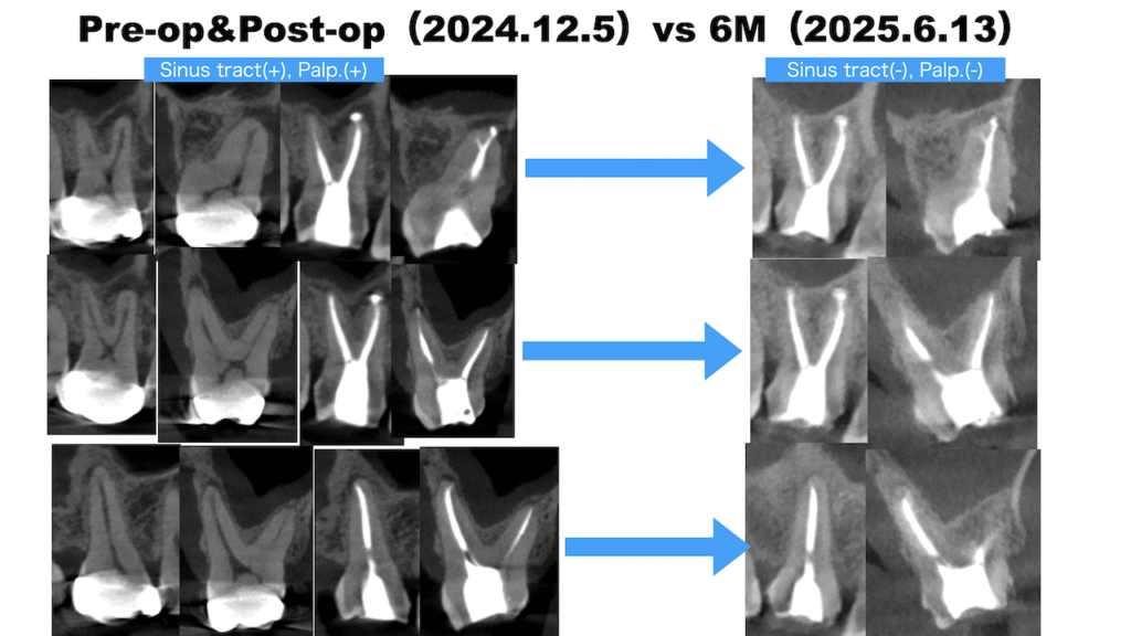 紹介患者さんの治療。 主訴は、 右上奥歯、歯茎が腫れて痛い… である。 初診時検査(2024.12.5) 患歯近傍の歯肉が腫れている。 そこを押さえると痛みがあるという。 PA(2024.12.5) CBCT(2024. … 続きを読む 右上奥歯、歯茎が腫れて痛い…〜#3 RCTと6M recallとCBCTの診断における破壊力とは?