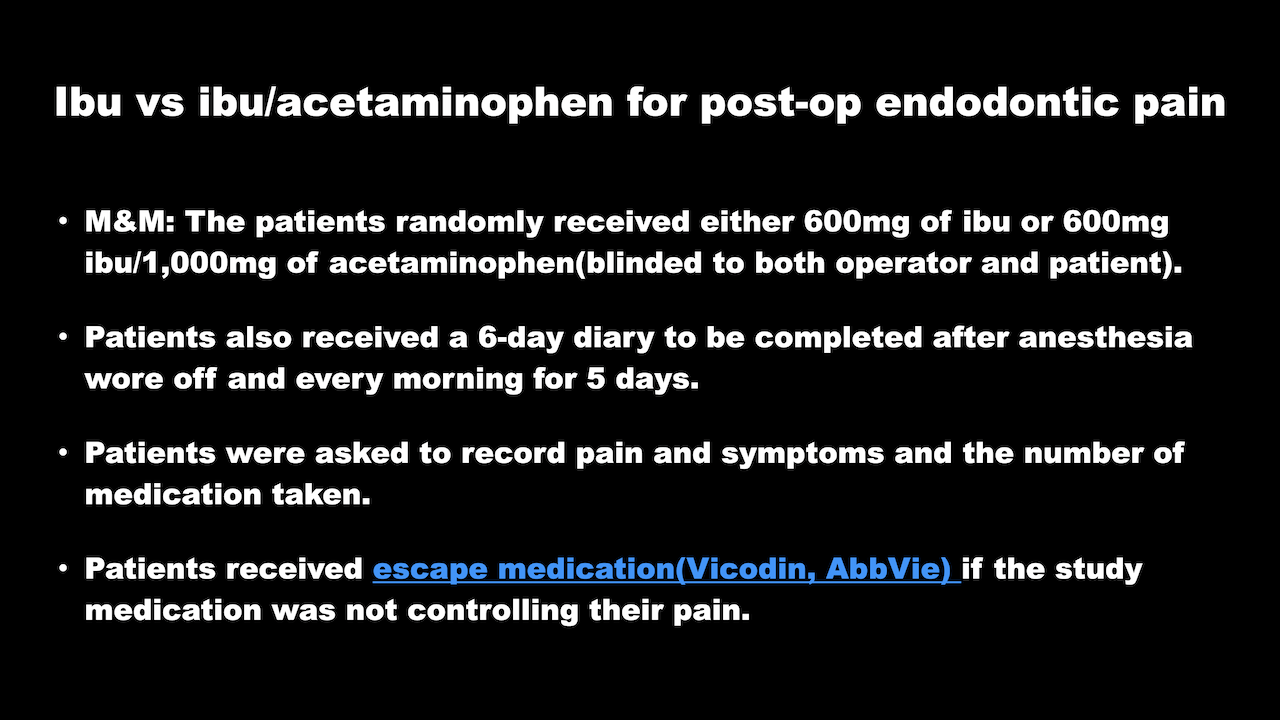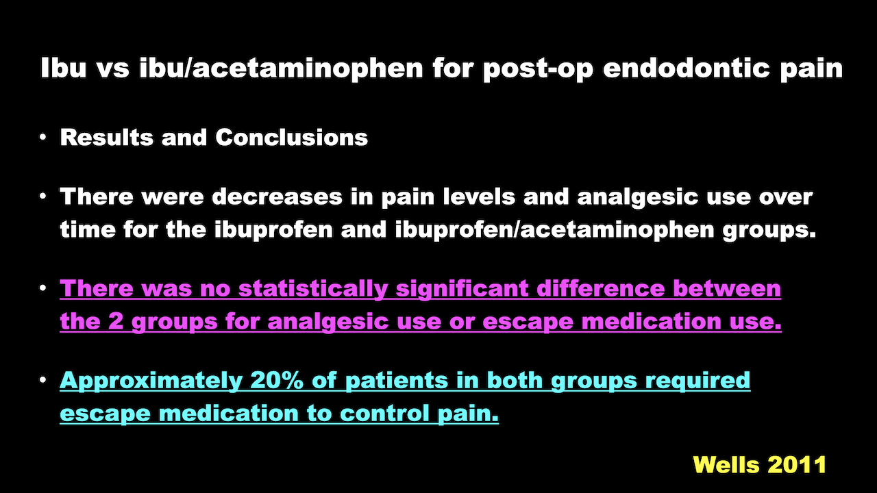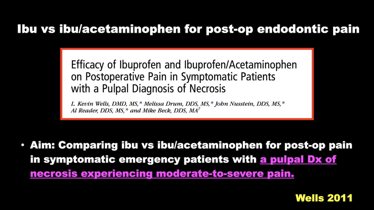 Wells 2011 Efficacy of Ibuprofen and ibuprofen/acetaminophen on postoperative pain in symptomatic patients with a pulpal diagnosis of necrosis