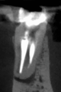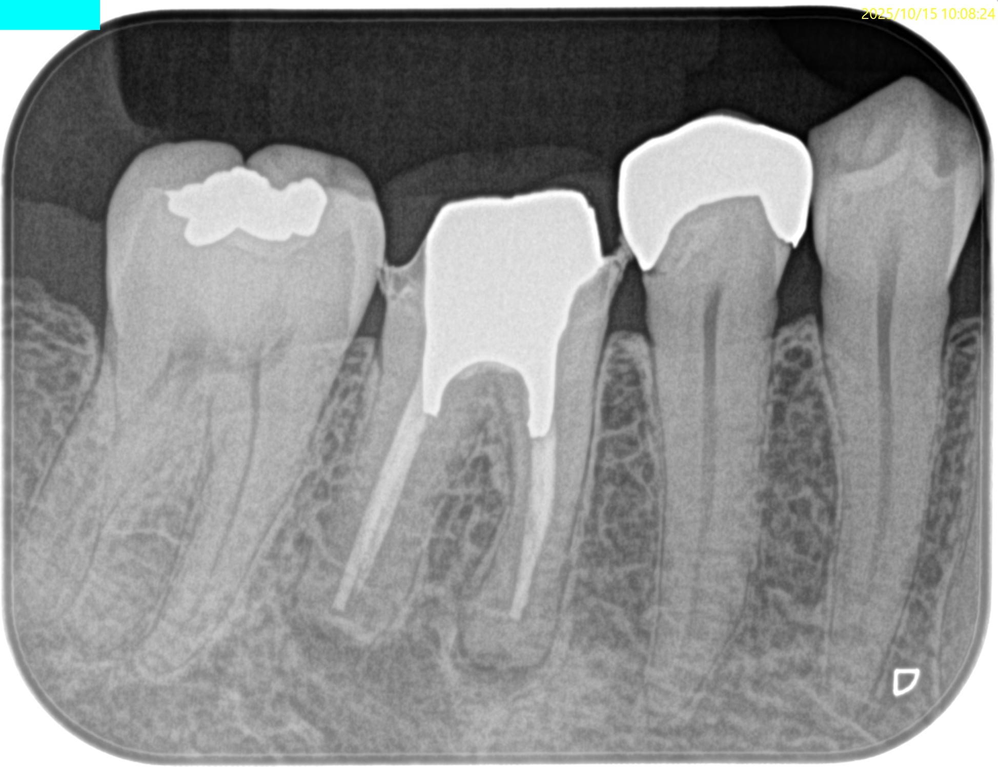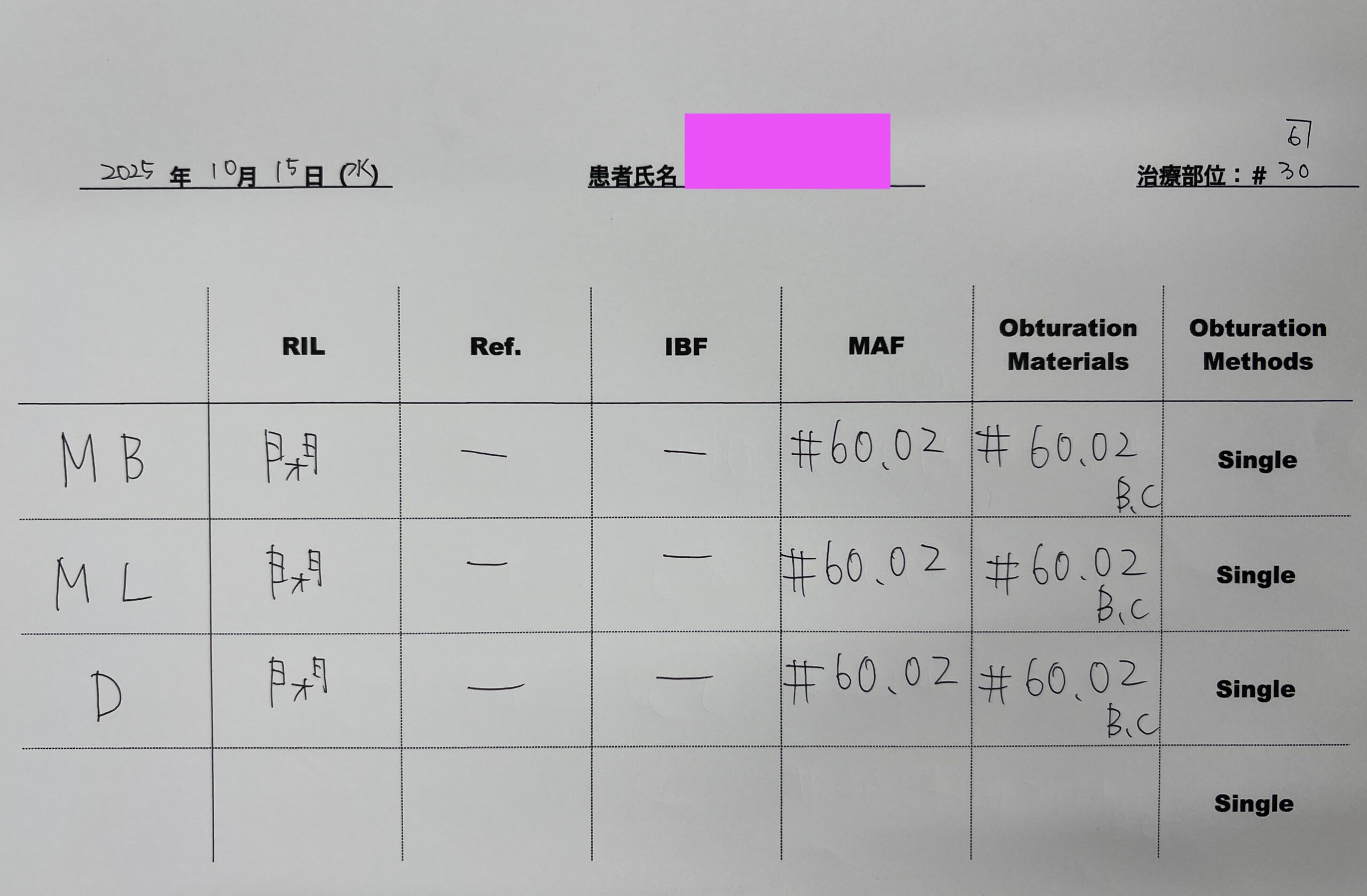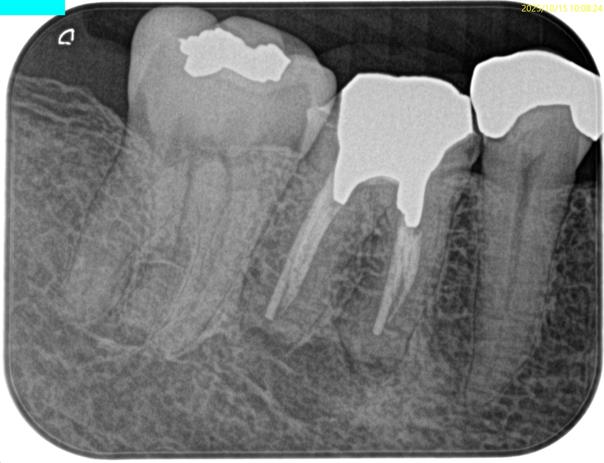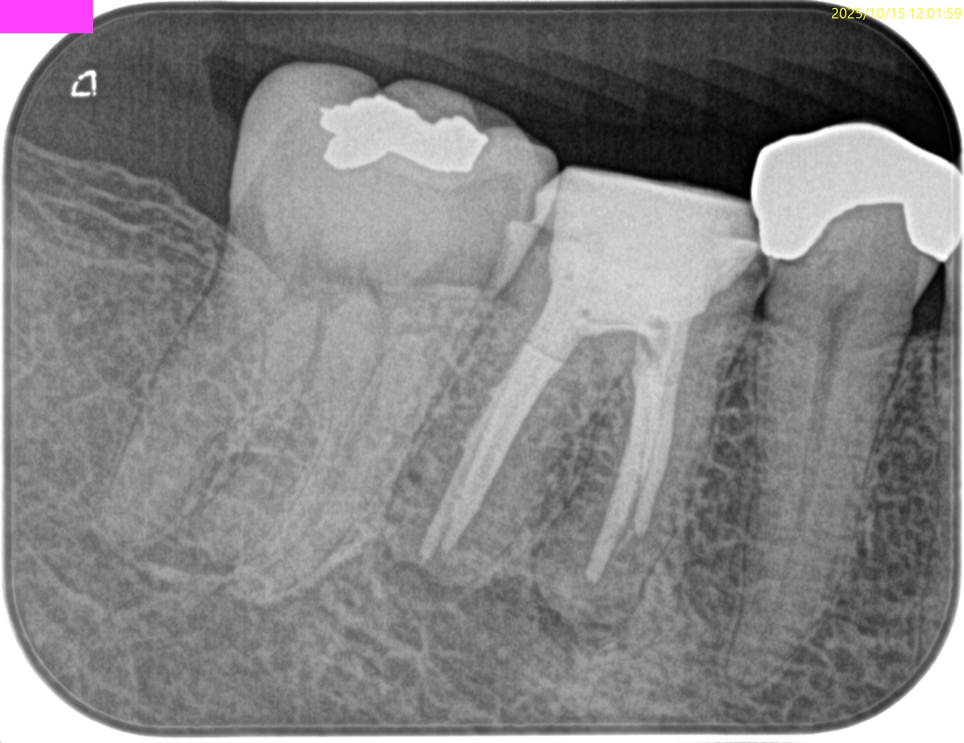 MLは穿通しなかったがこれは細かいGutta Percha Pointが残存したか?破折ファイルの存在か?もしれない。