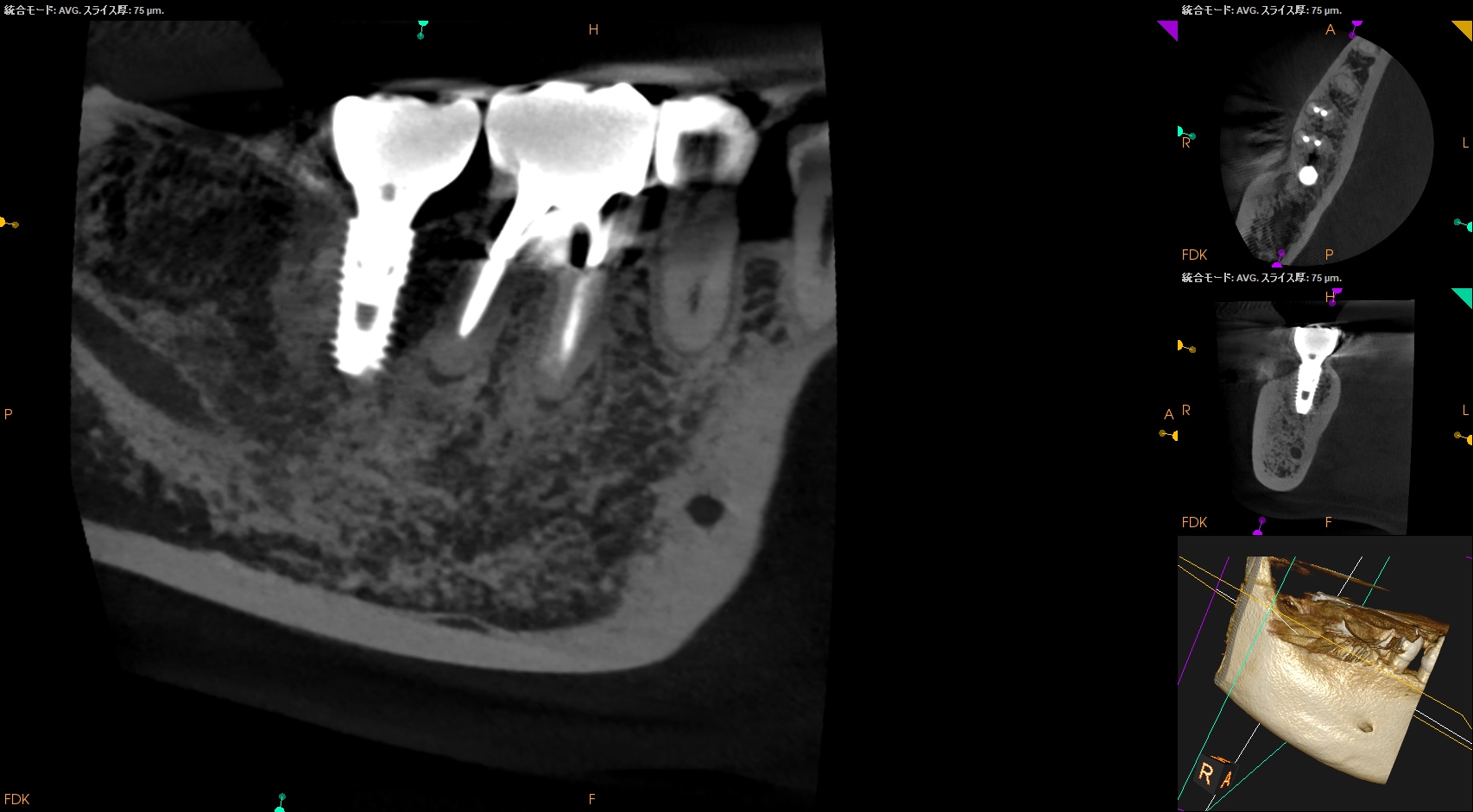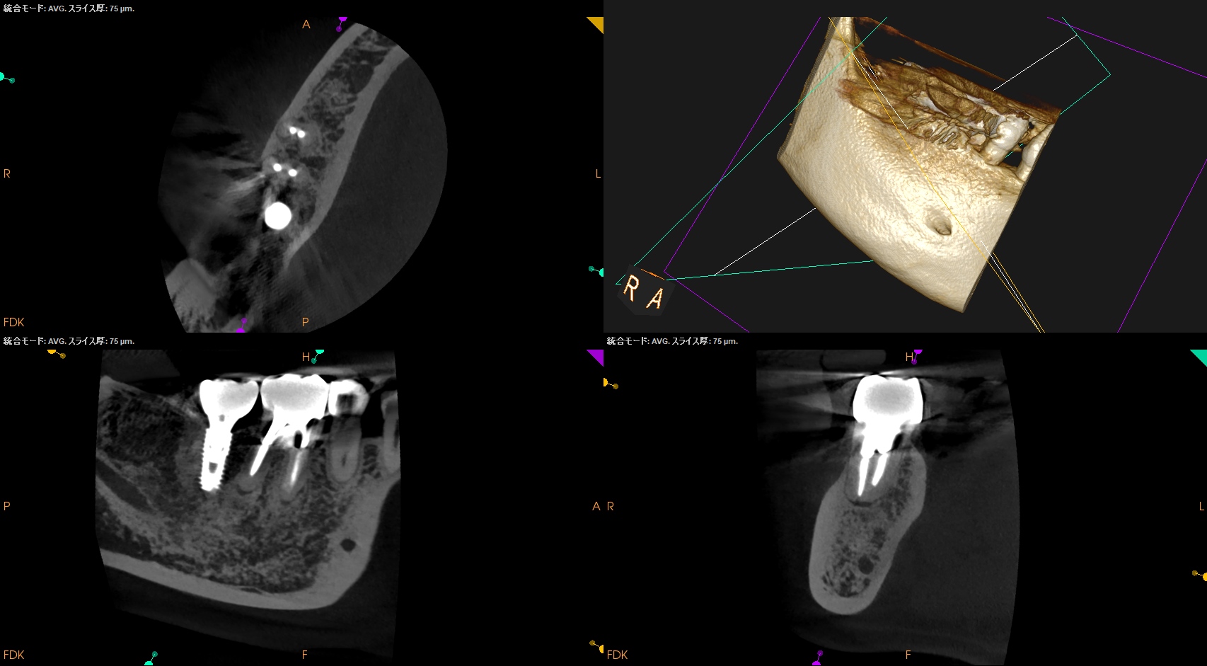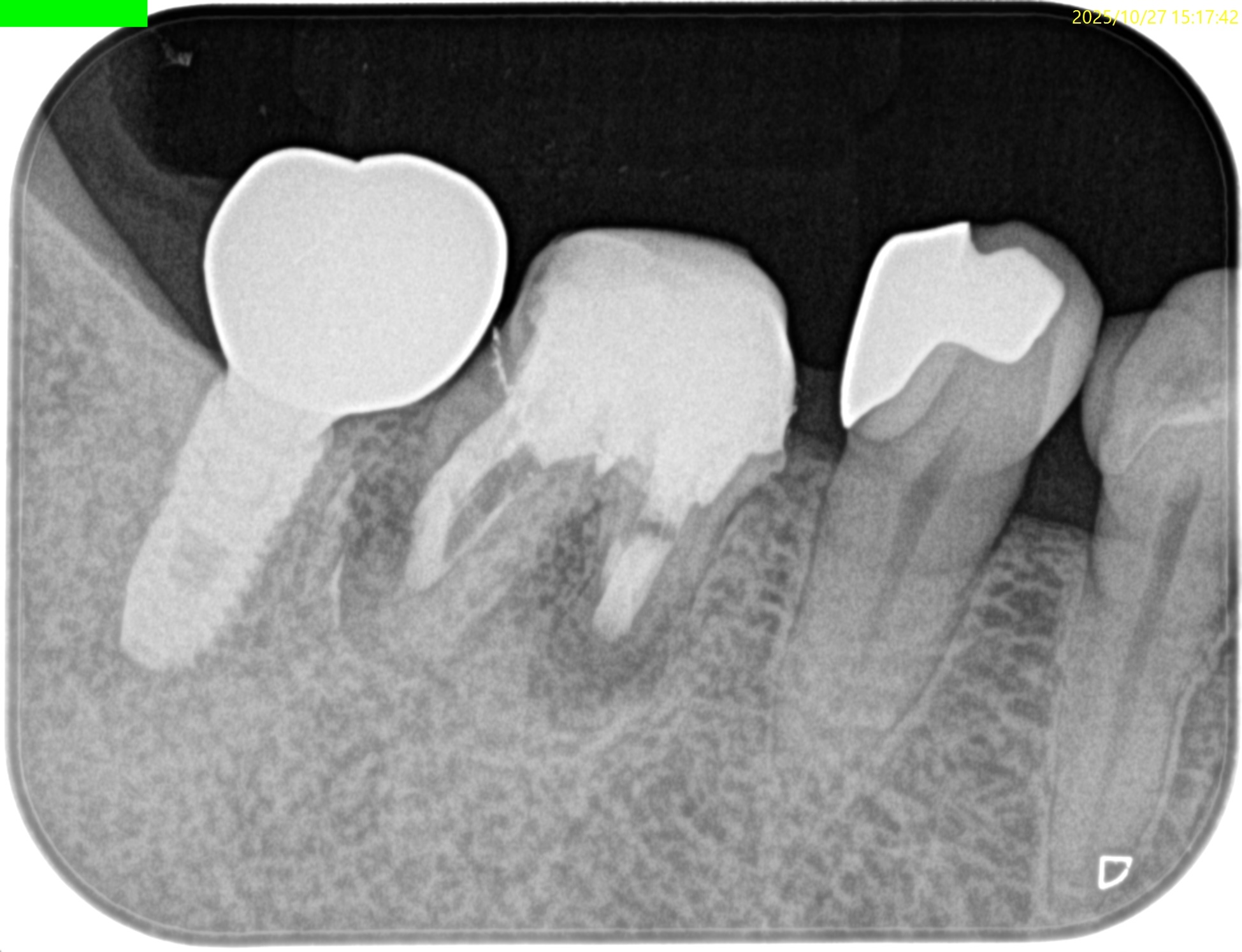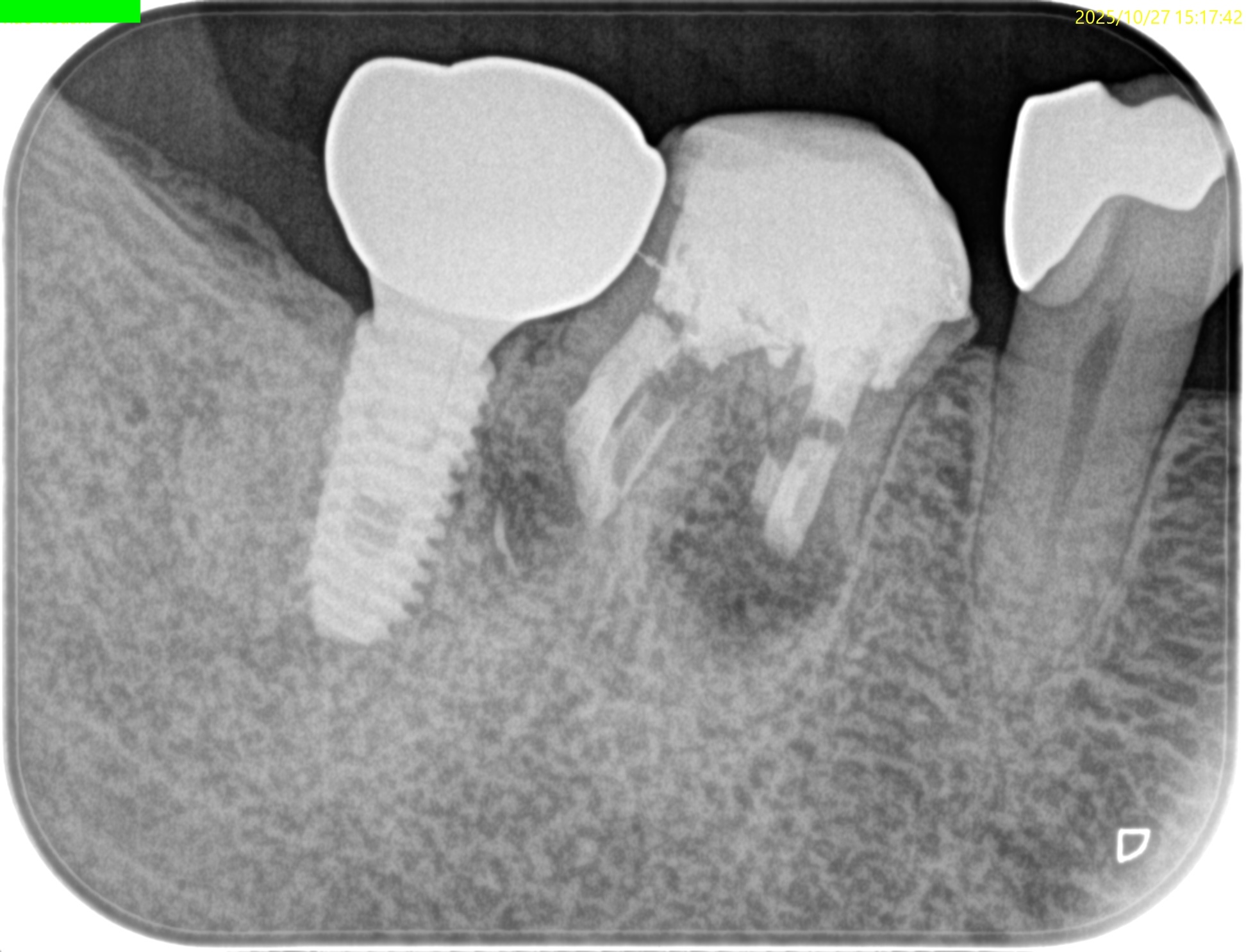 右下のインプラントの隣の歯の根の先に病気があり、このままだとインプラントに影響があると言われた。インプラントはお金がかかったので何とか治療して悪い歯を直してインプラントを守りたい。
