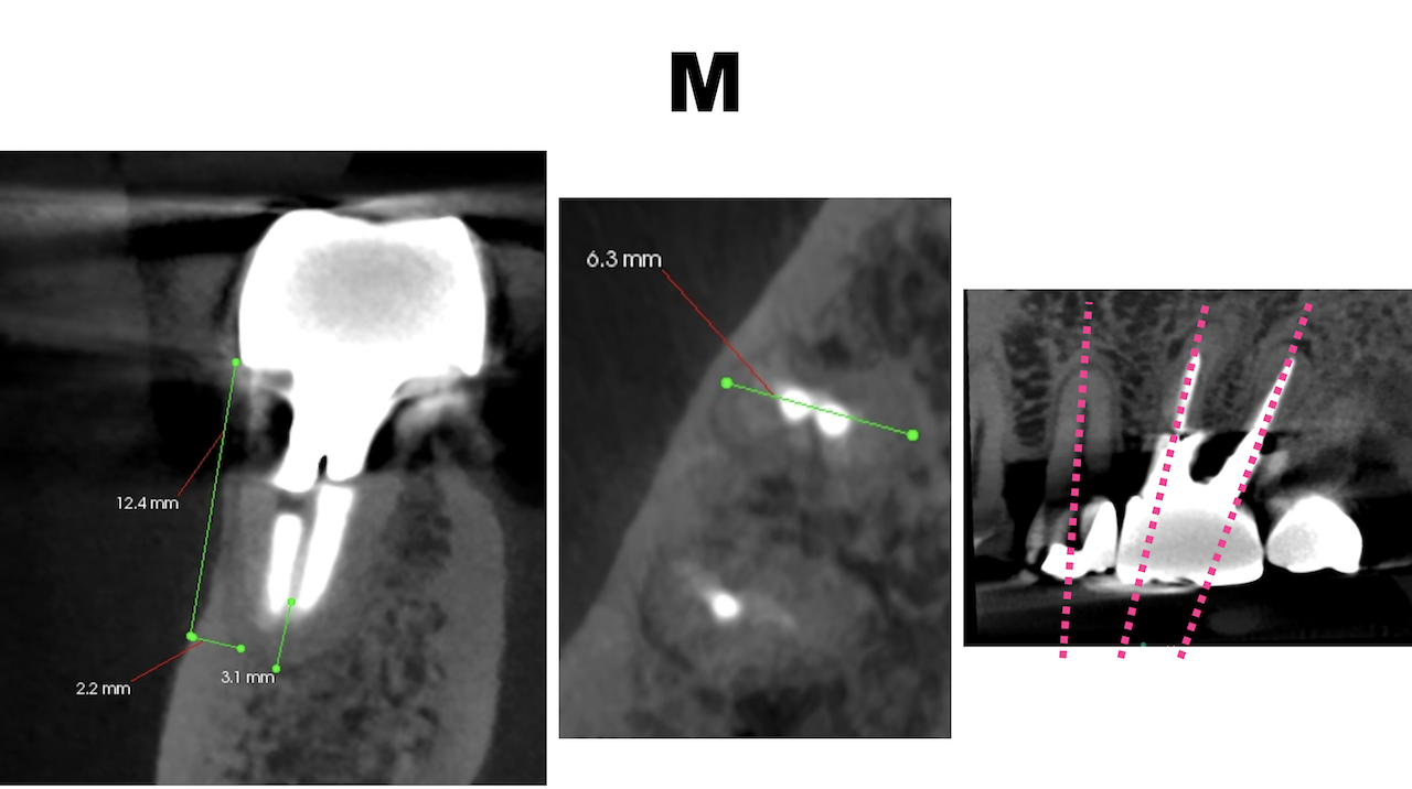 MのApexに到達するにはCEJよりも12.5mm下方の歯槽骨を2mm削合(Osteotomy)しなければならない。