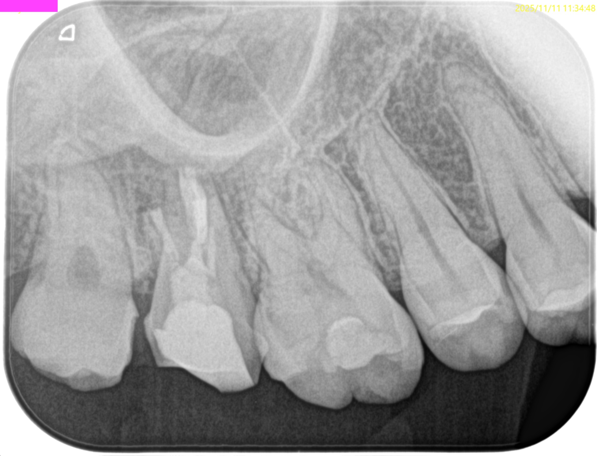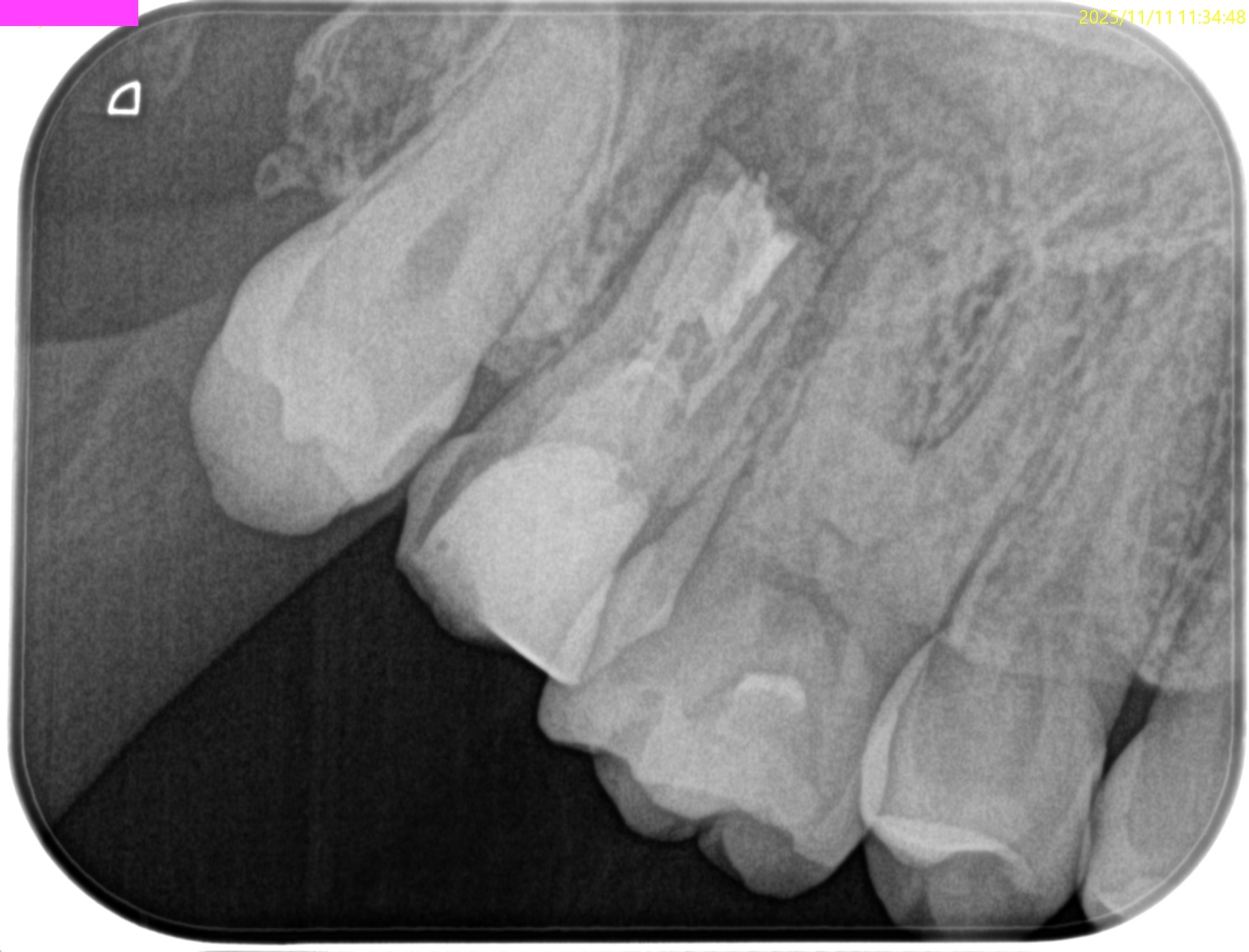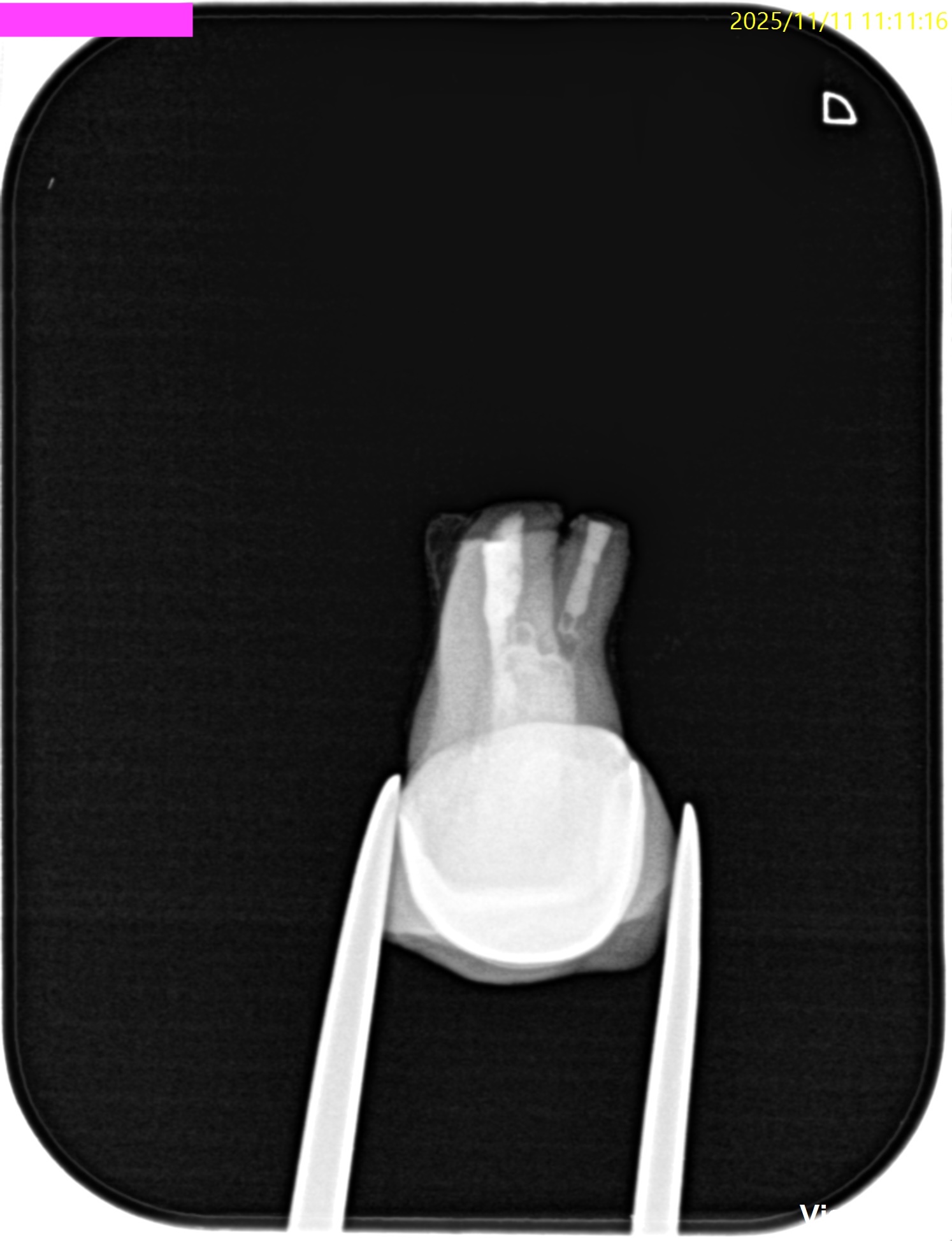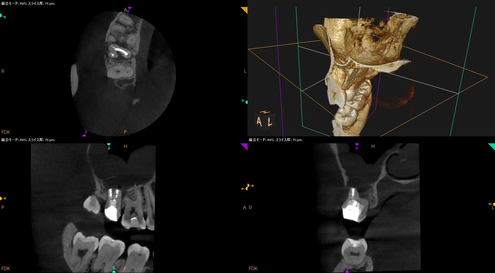 根管は石灰化&すでに拡大済みであるので、再根管治療ではなく外科治療、つまり、Intentional Replantationの適応症である。