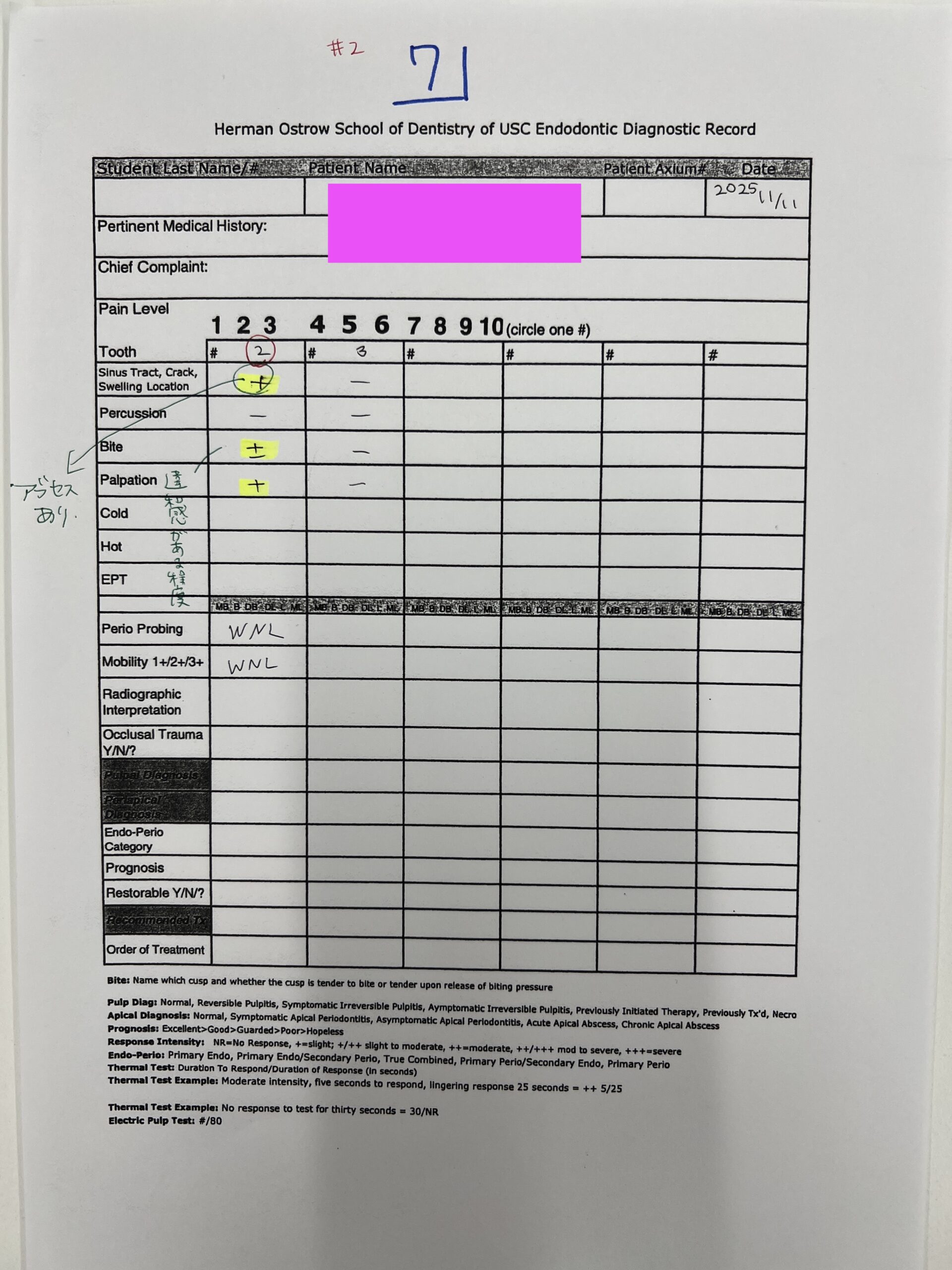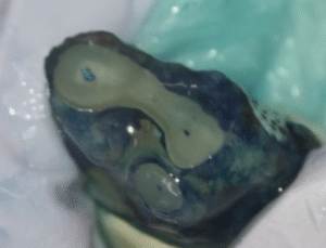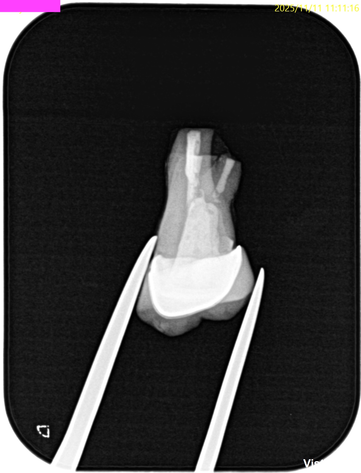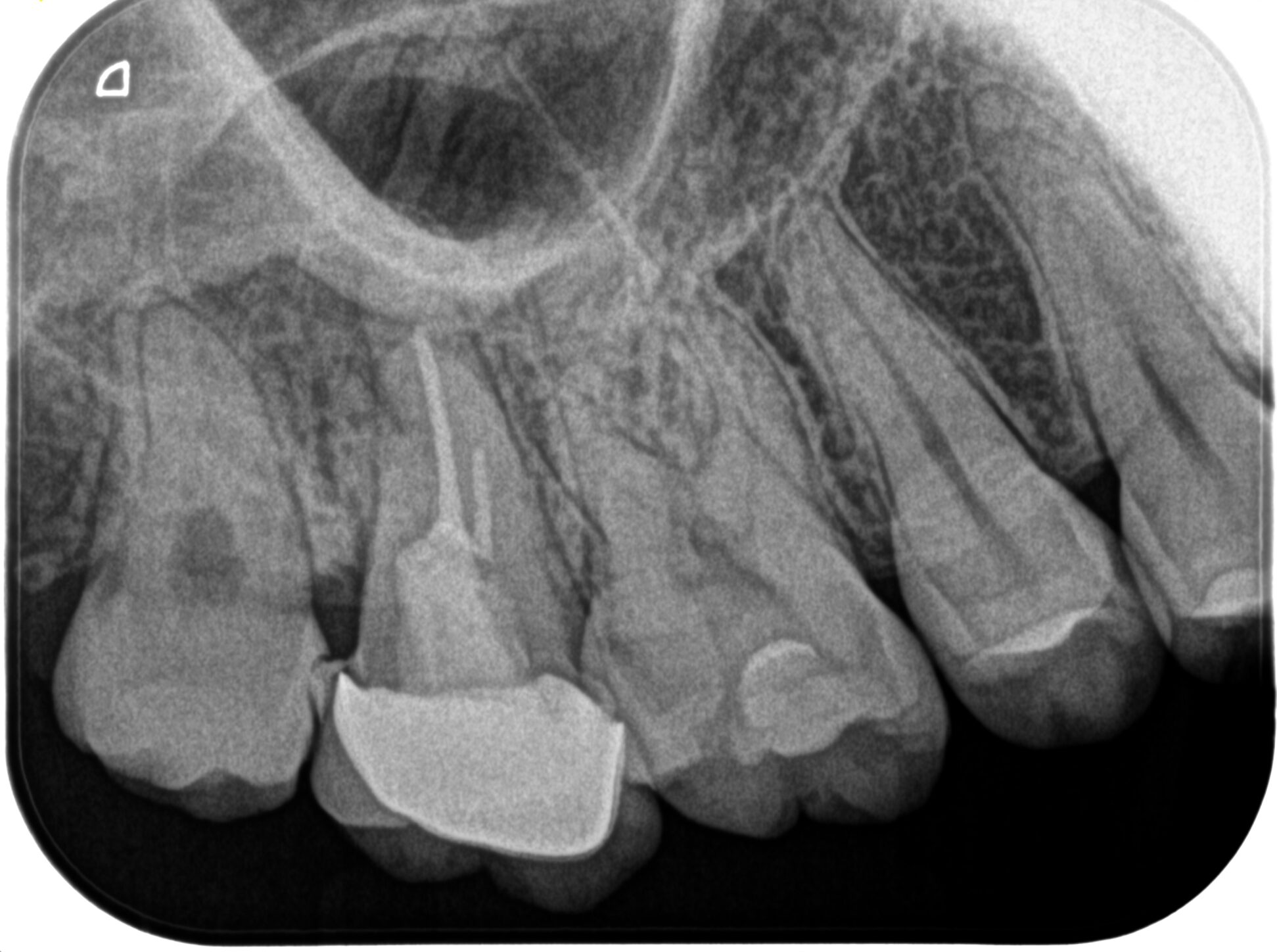 根管は石灰化&すでに拡大済みであるので、再根管治療ではなく外科治療、つまり、Intentional Replantationの適応症である。