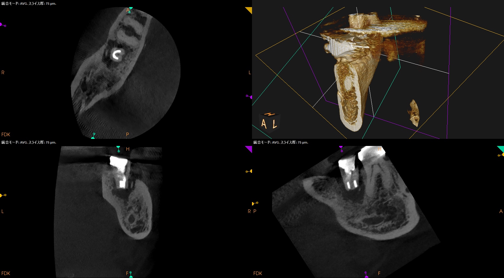 築造後に口腔外で歯冠形成し、抜けた逆根管充填材も修正した。