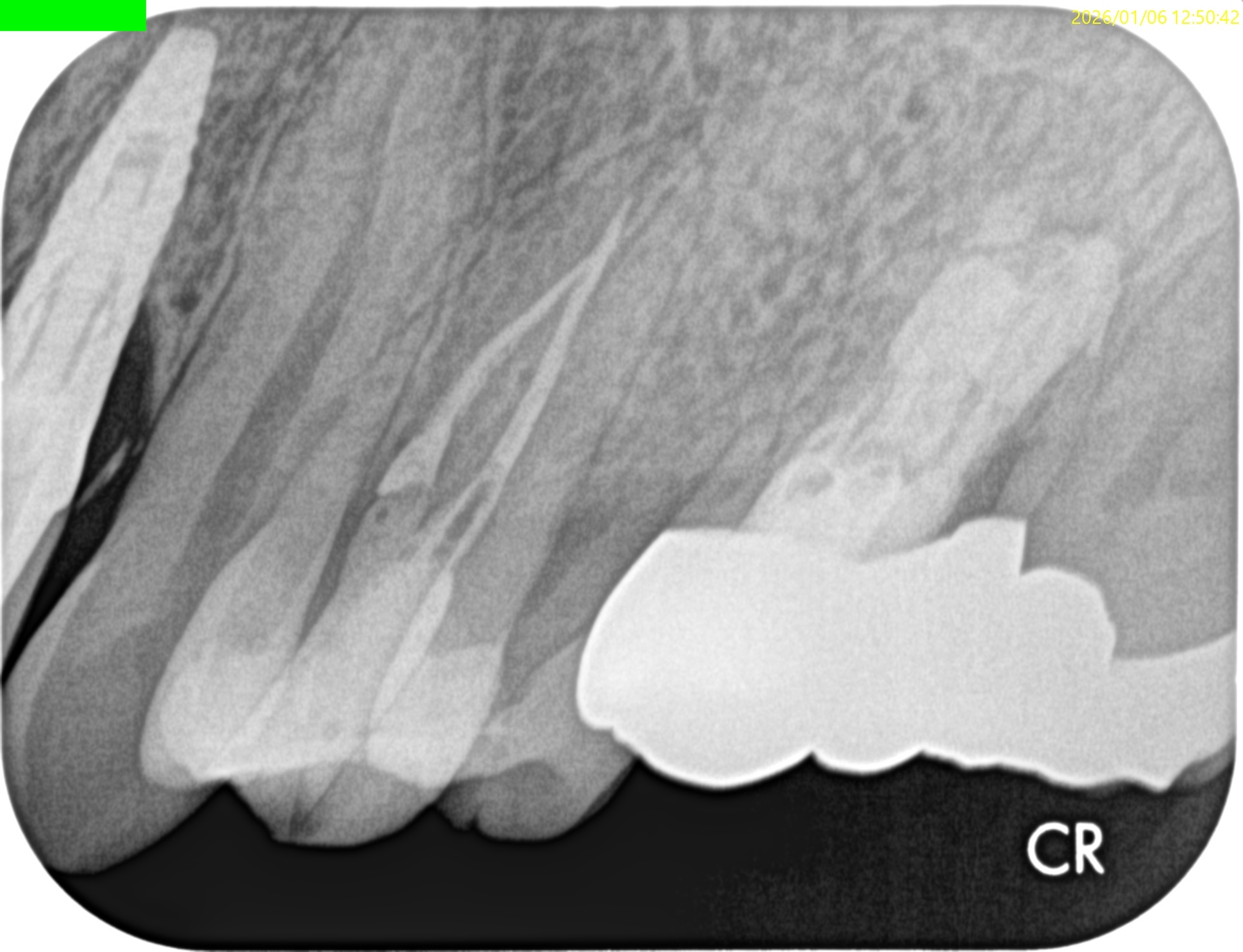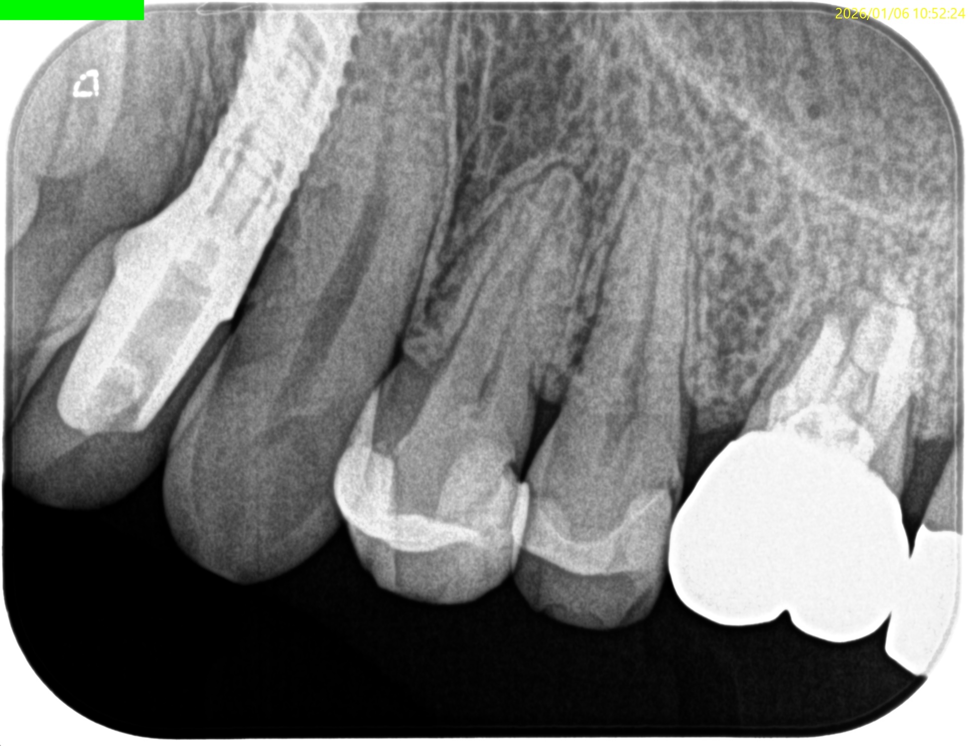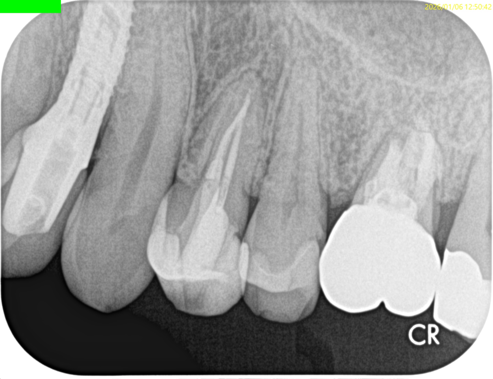 他院でメタルインレーをレジンに変えた後に冷水痛があり、その後違和感が出たようだ。