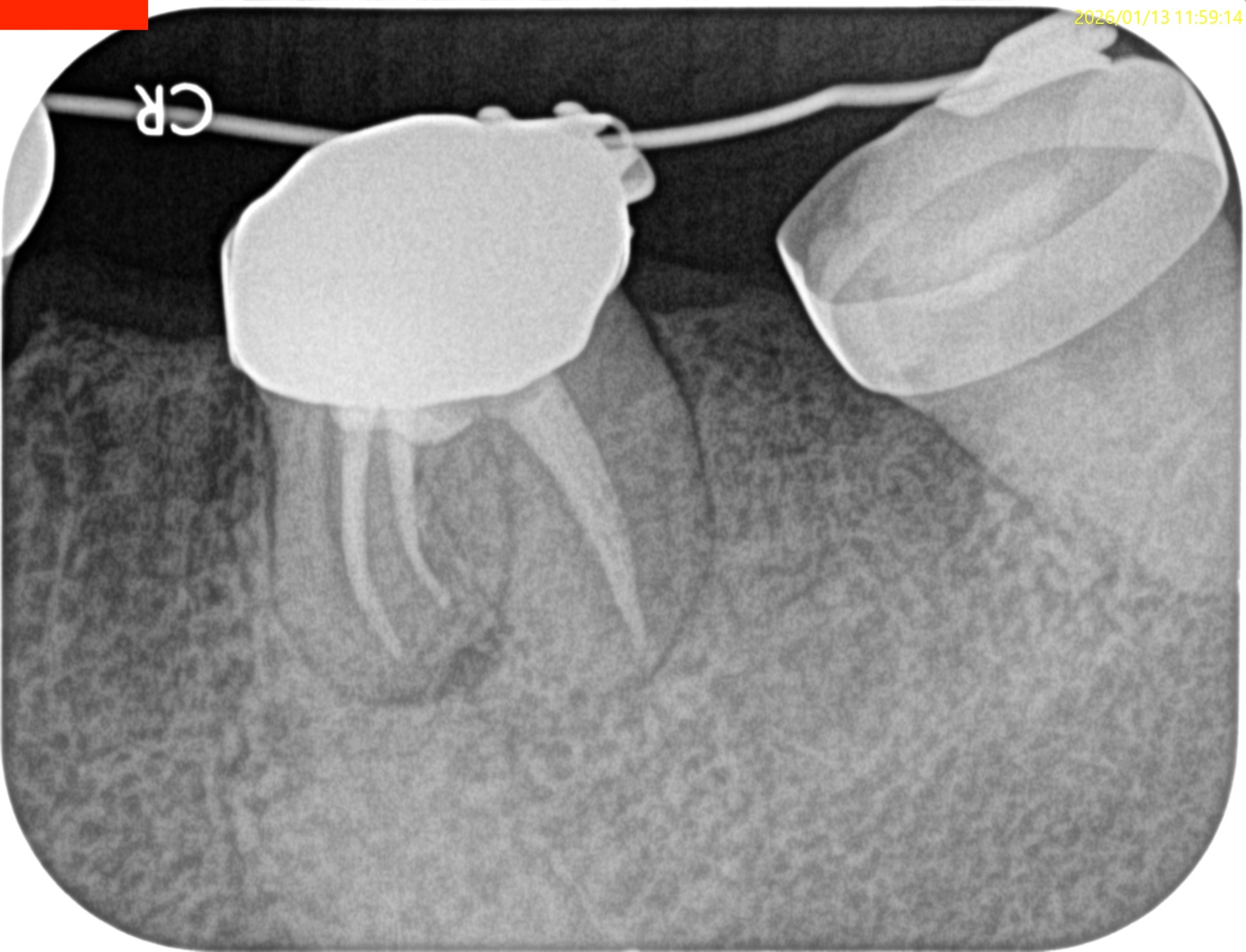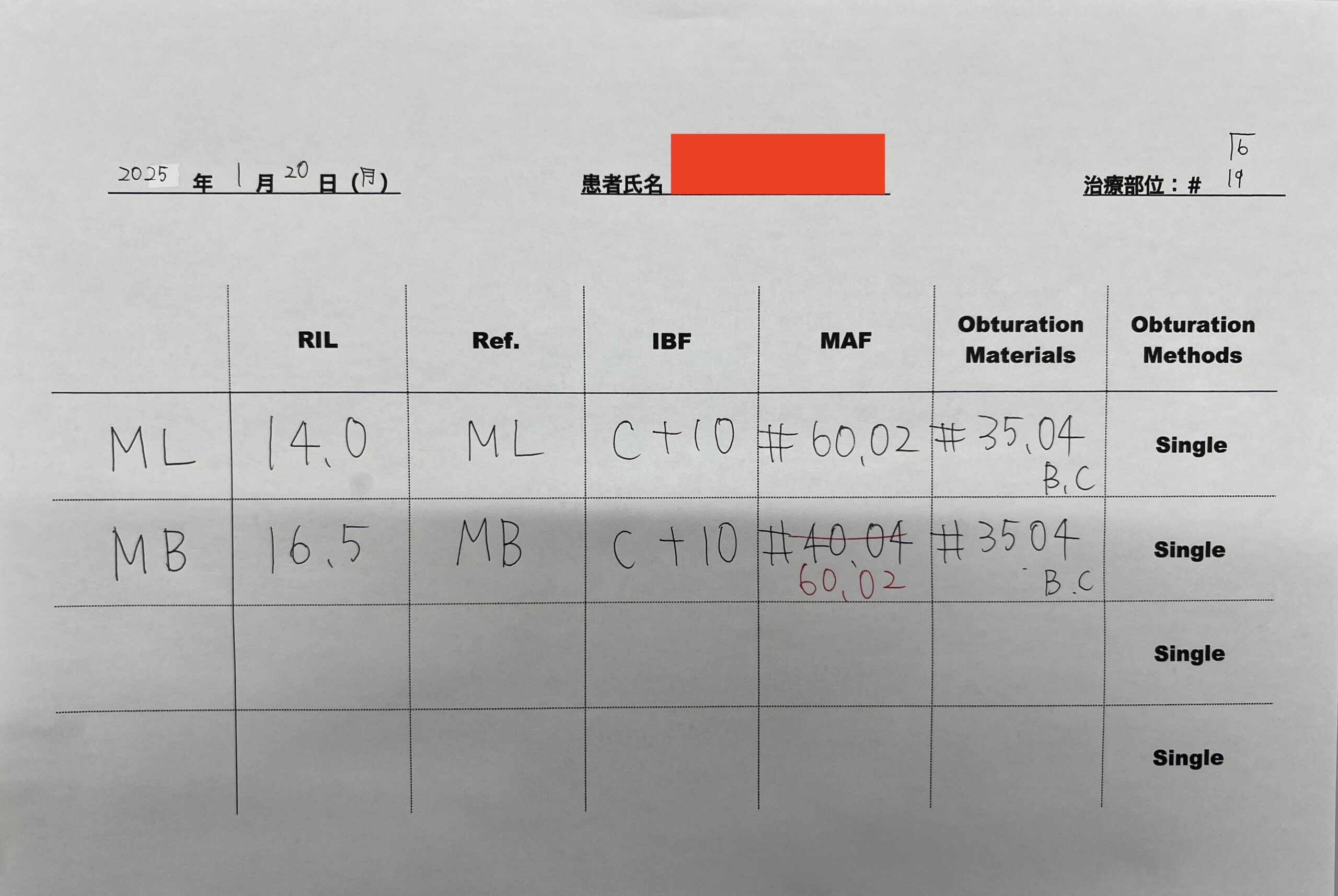 根尖病変があるのは近心根のみであるので近心根のみ再根管形成することにした。