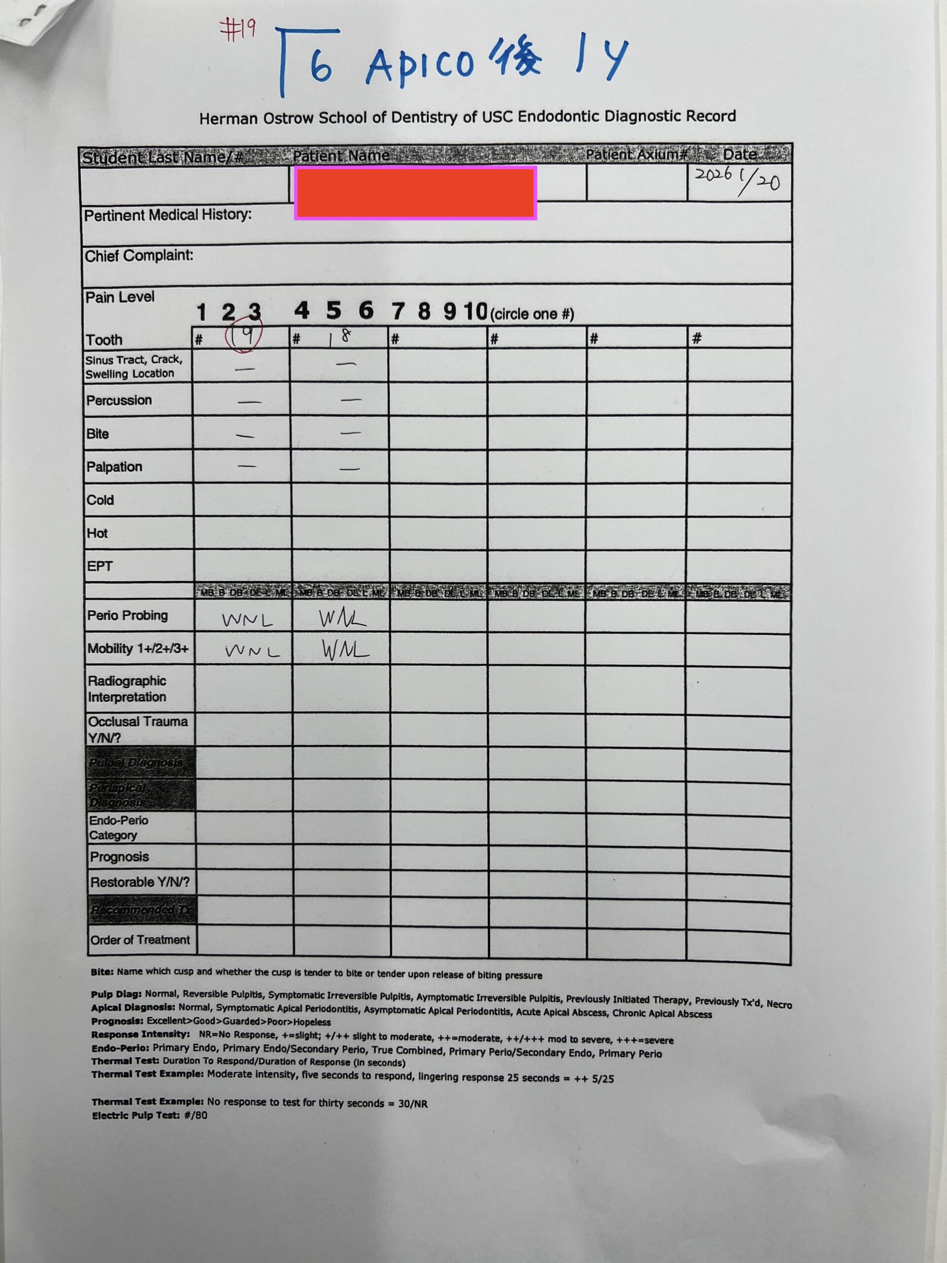 #19 Cold N/A, Perc.(+), BT(+), Palp.(-), Perio Probe(WNL), Mobility(WNL)
