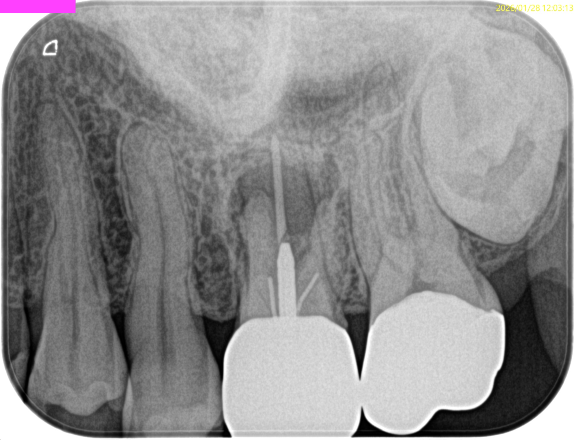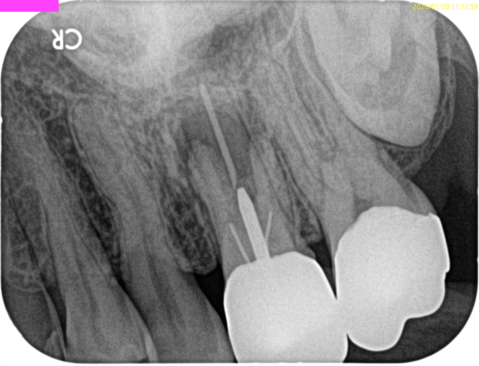 HyFlex EDM #10.05を高速回転(650rpm, 最少N)で使用し根管を突いて穿通させた。