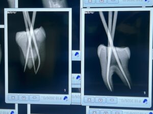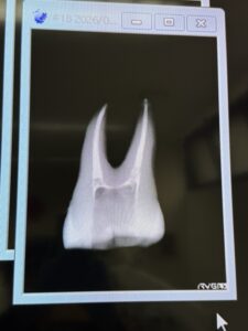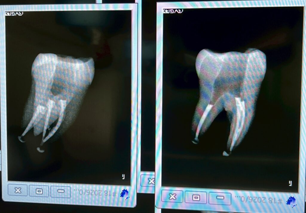 下顎の近心根は術前にCBCTを撮影し、MB,MLが合流していると認識して合流の位置を確認して根管充填している。