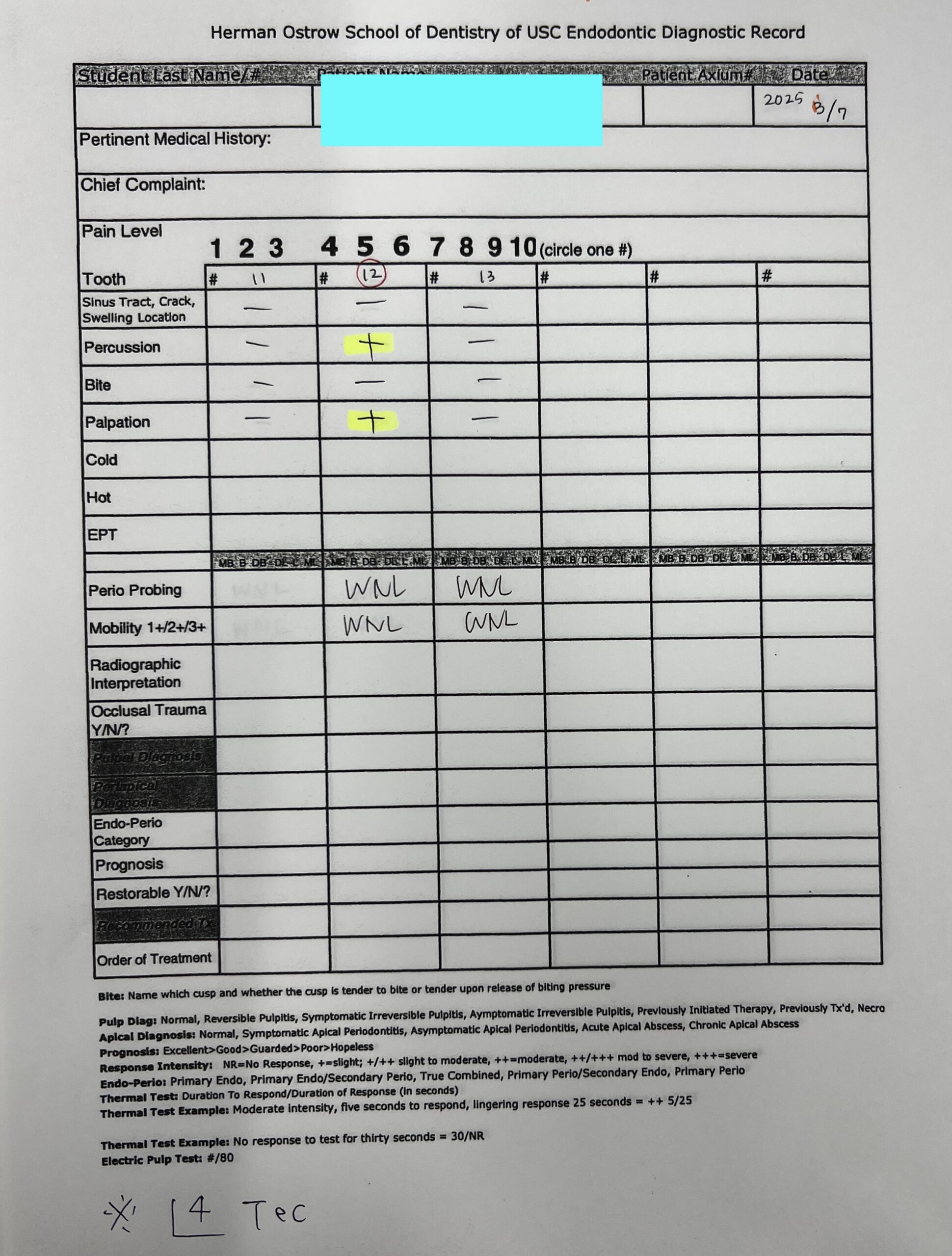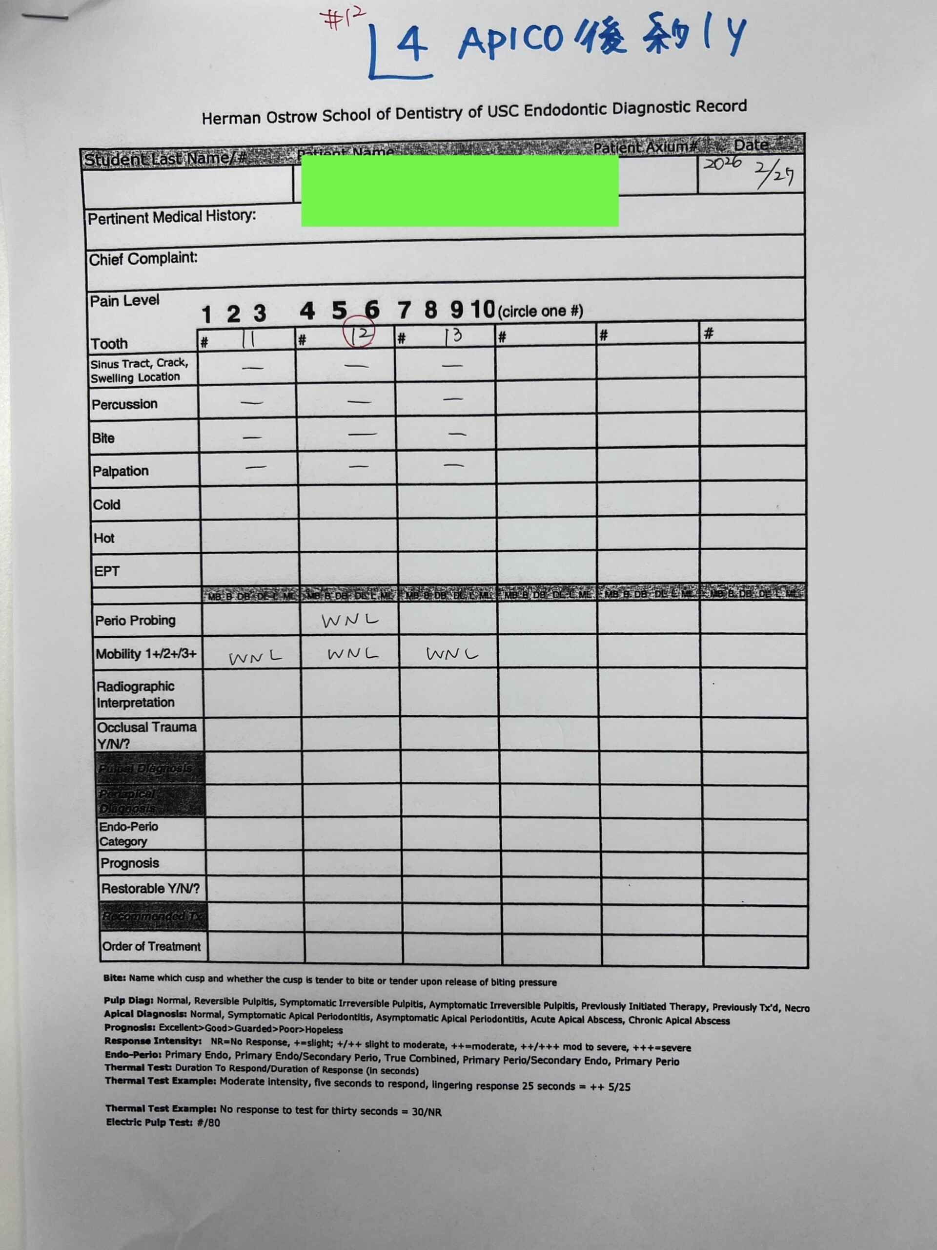 #12 Cold++1/13, Perc.(+), Palp.(-), BT(-), Perio Probe(WNL), Mobility(WNL)
