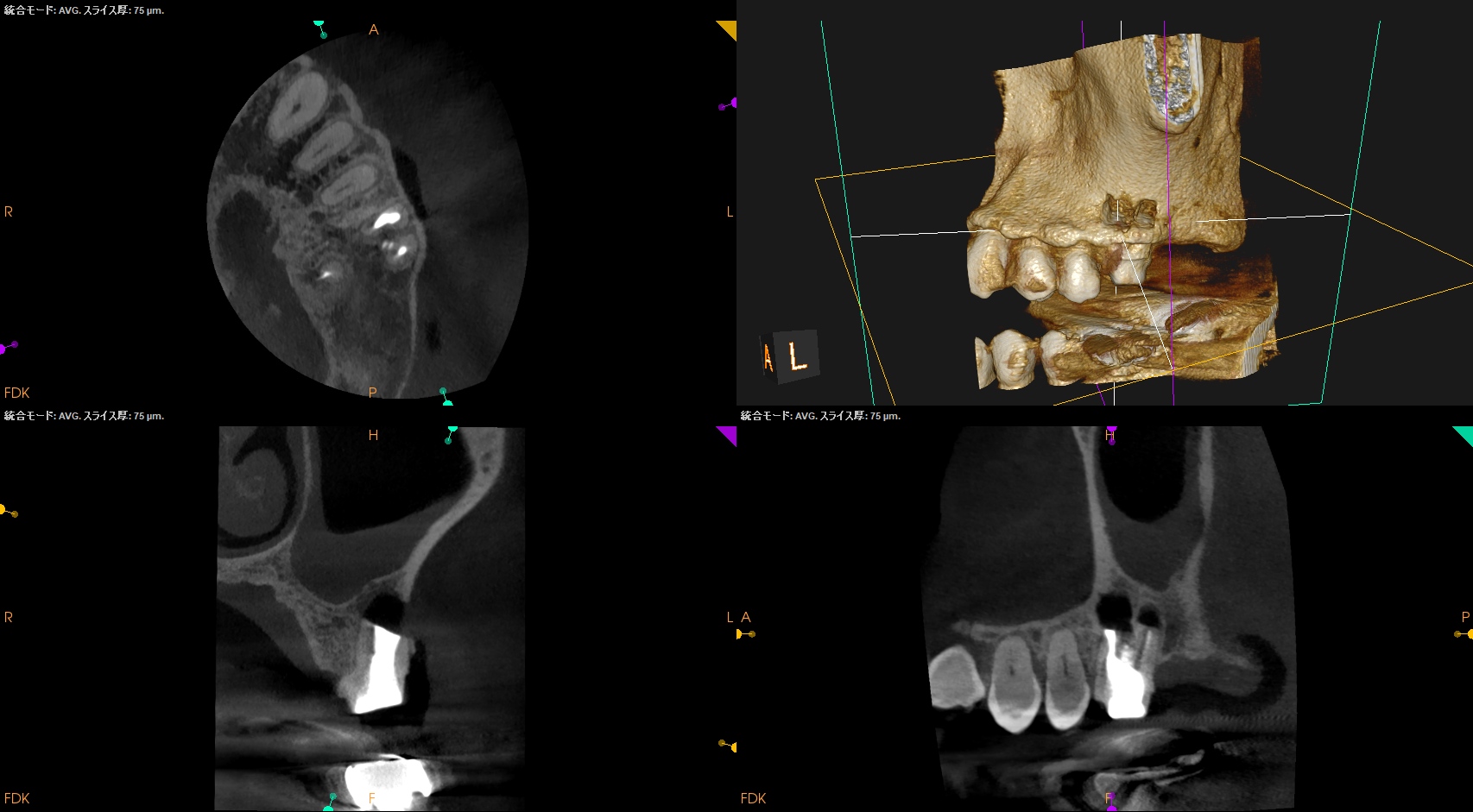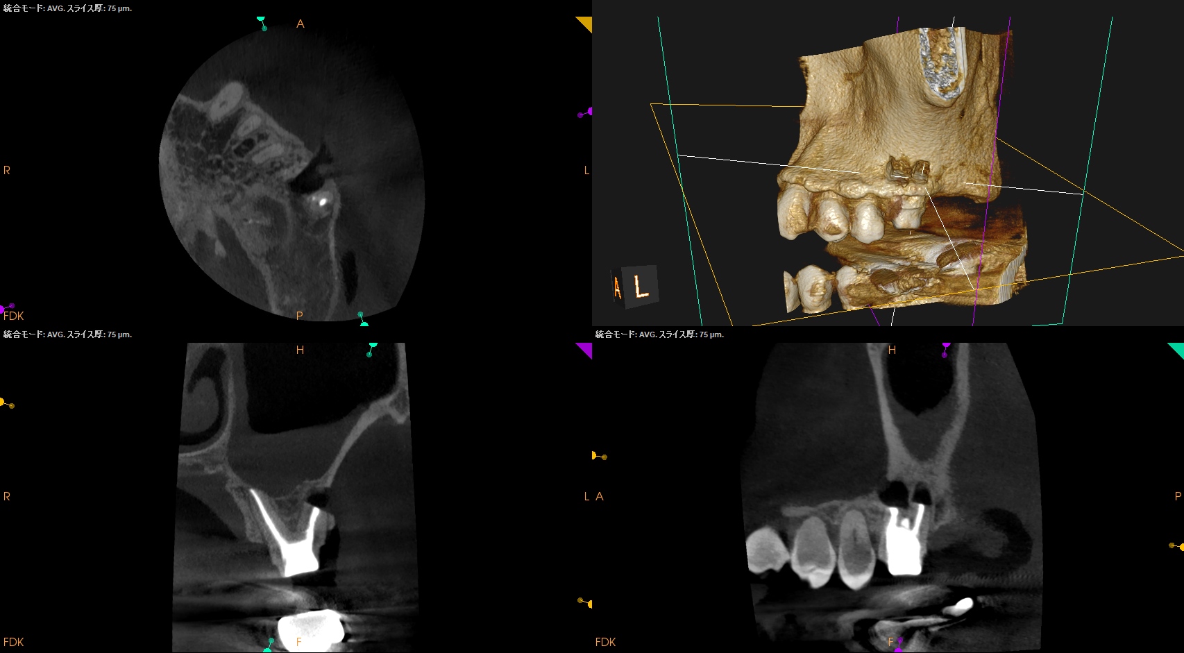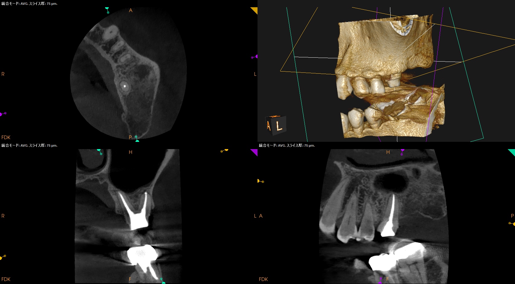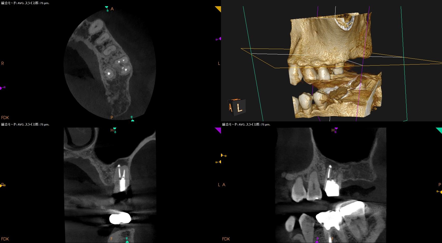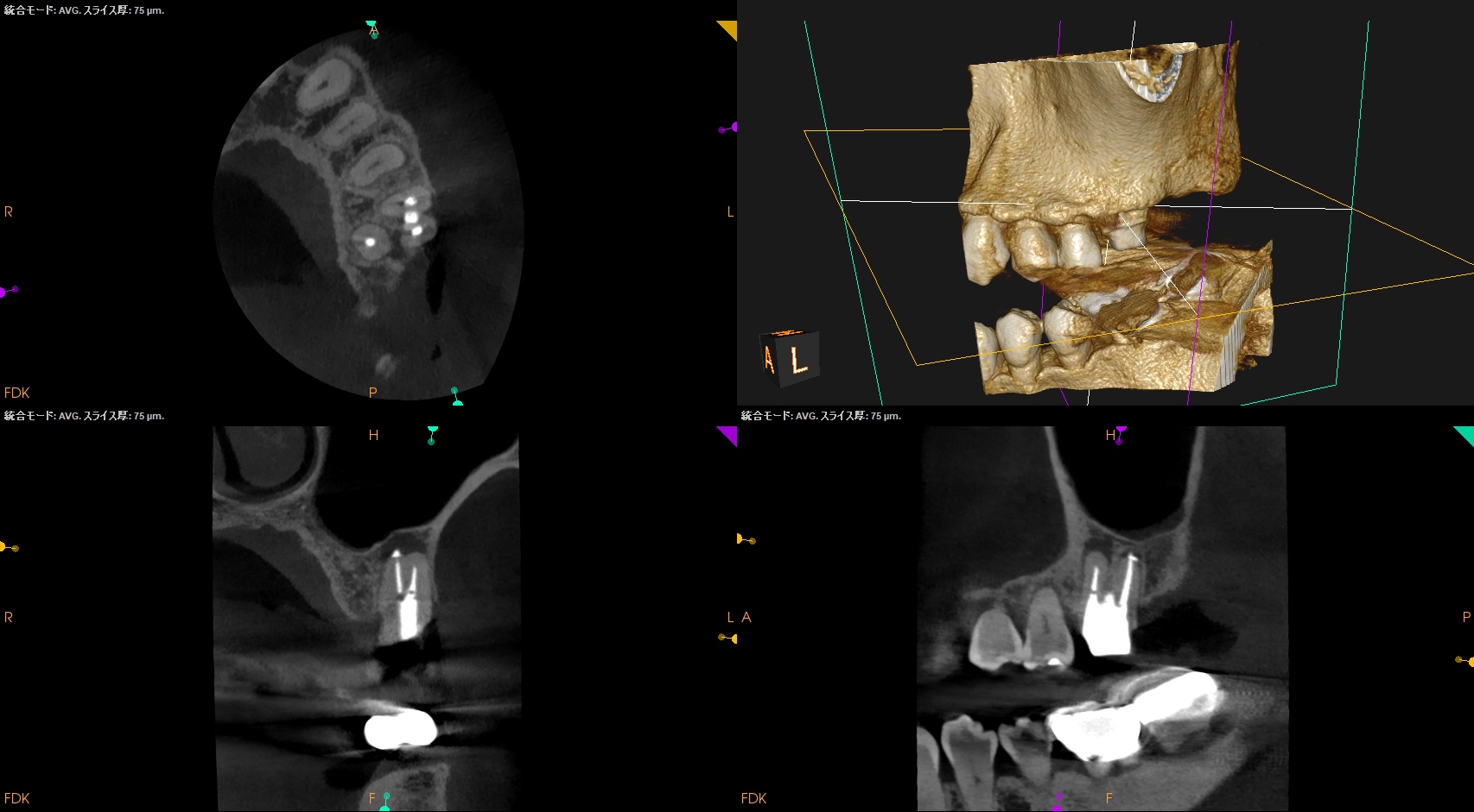 この際の断面が上記のCBCTの絵に掃除であれば問題ないが、切り残し(アゴ)が残存したので切断し直している。