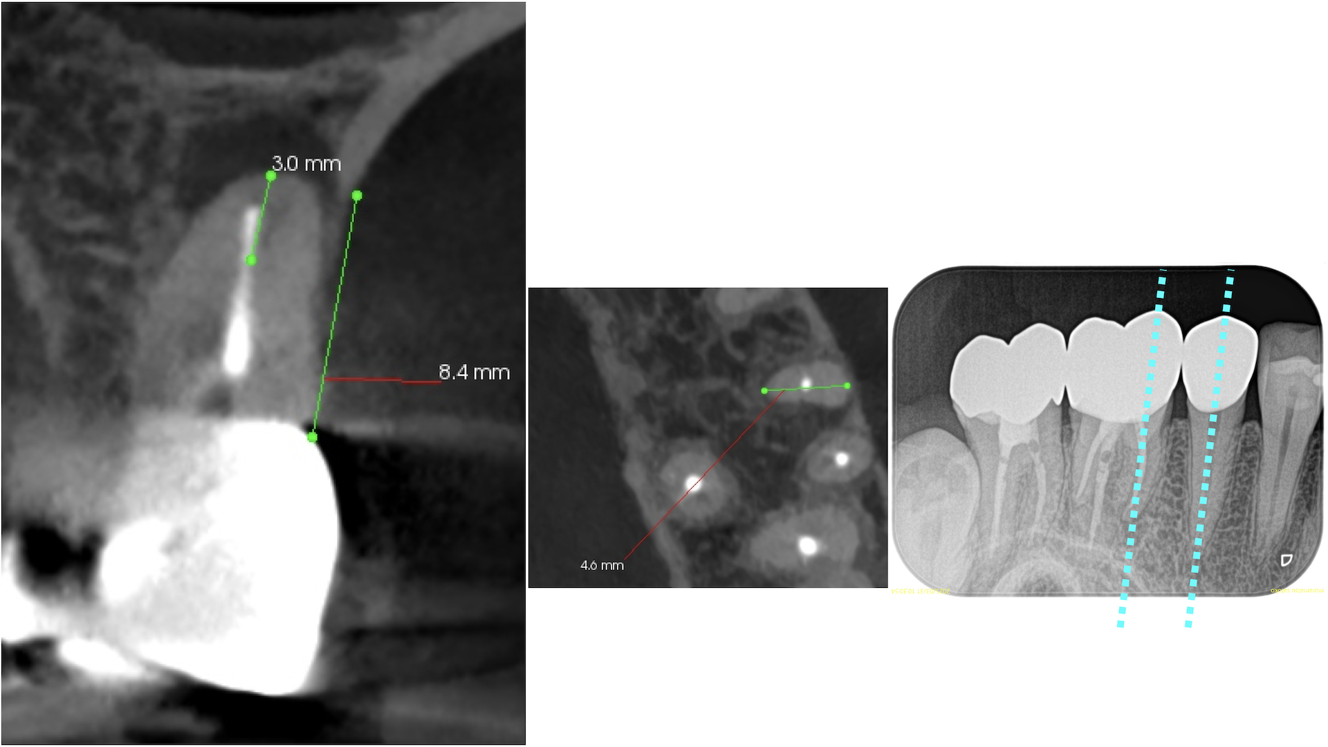 クラウンのマージンより8.5mmの位置にMBのApexがあり3mm切断するには頬舌的距離が4.6mm必要で、MB2もないというまさにこの歯は奥歯だが、